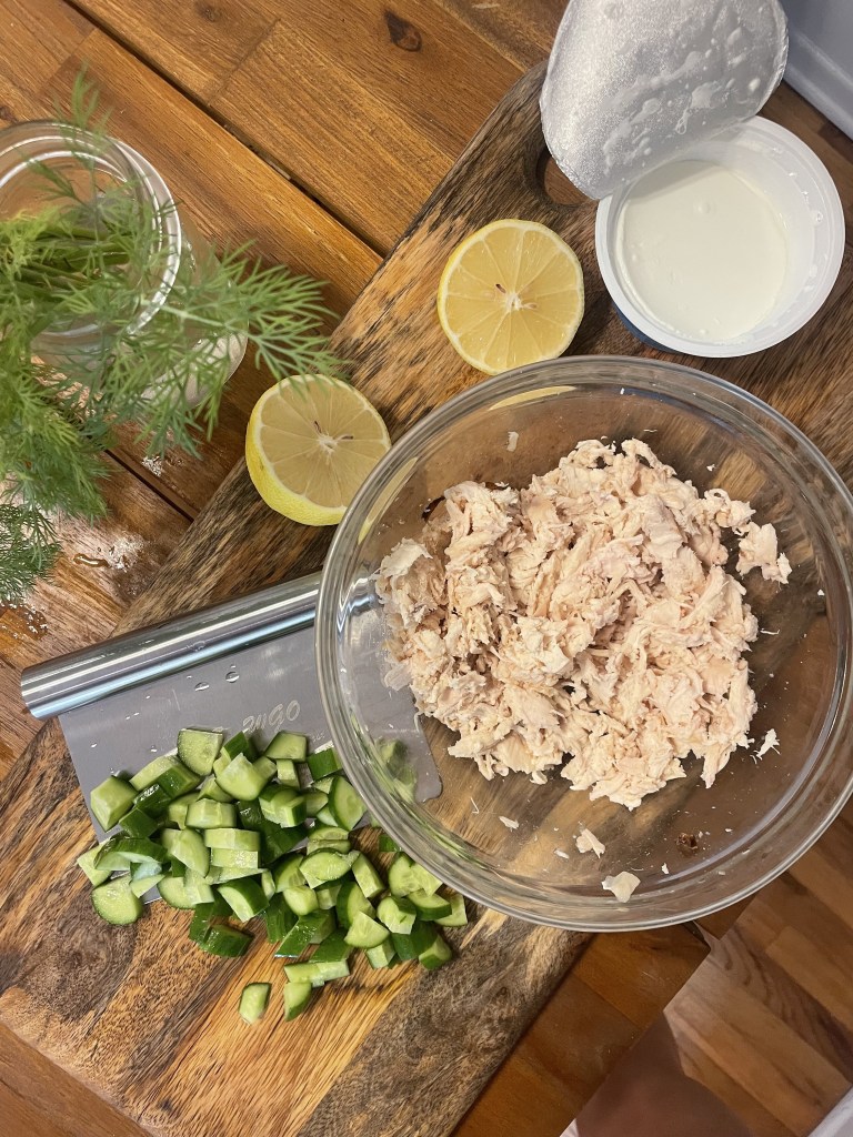 - Prepare ingredients: In a large mixing bowl, combine the shredded chicken and chopped cucumbers. Chop mint and dill into fine pieces.