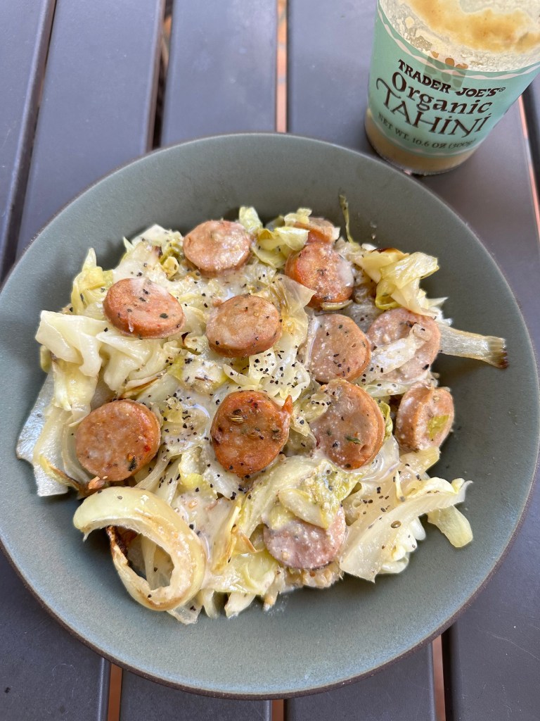 - Serve: Once the cabbage and sausage are roasted, remove from the oven. Drizzle the tahini lemon dressing over the top and serve warm.