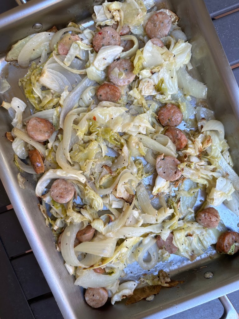 - Roast: Place the baking sheet in the oven and roast for 25-30 minutes, flipping halfway through, until the cabbage is caramelized and the sausage is golden.