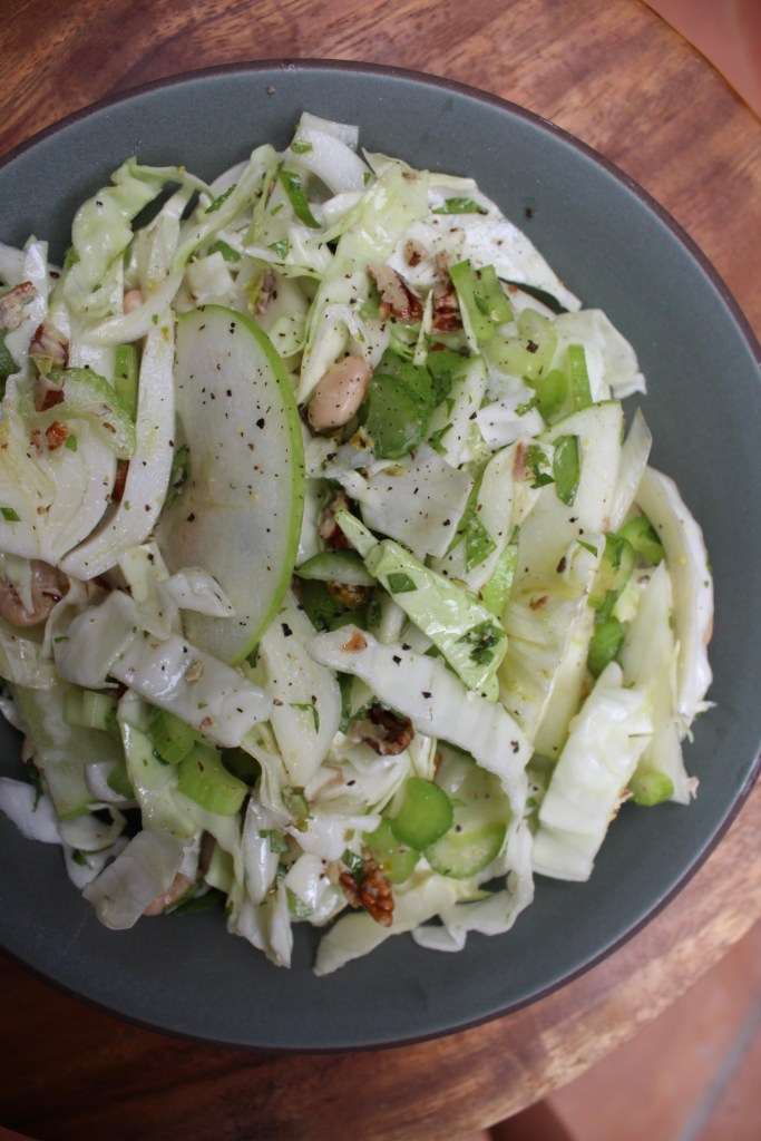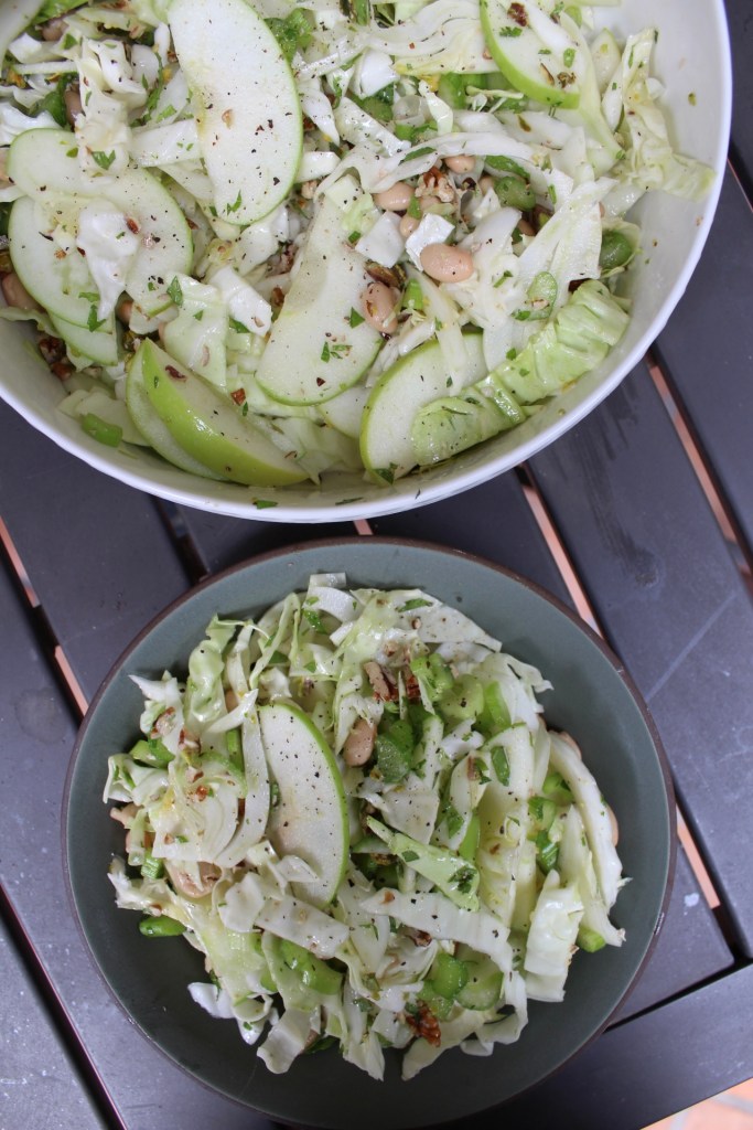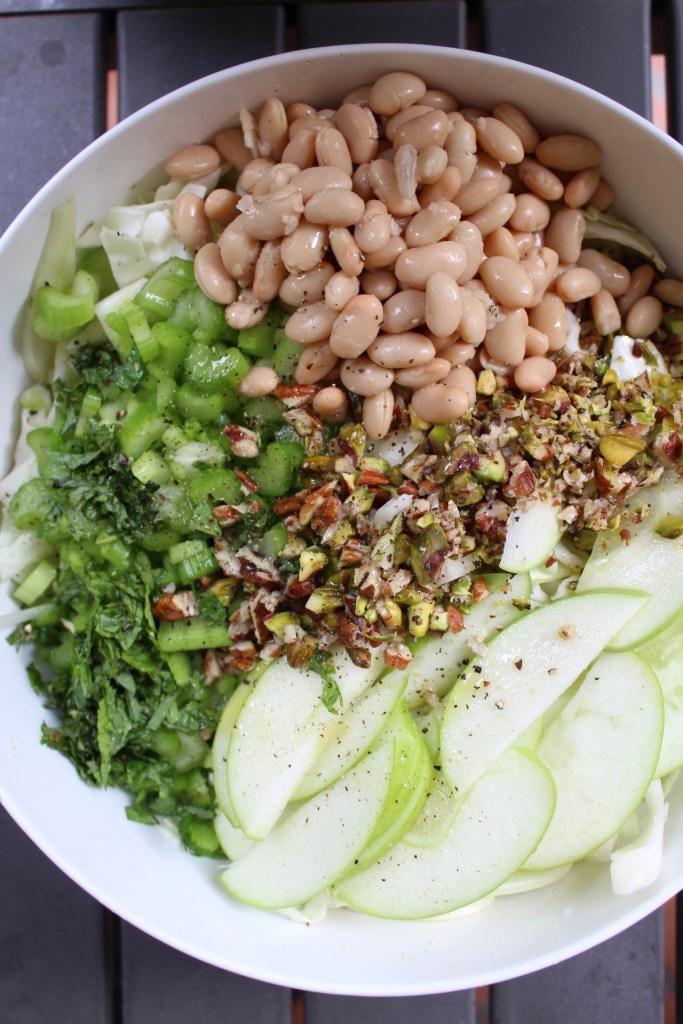 2. Combine the Base: In a large salad bowl, add the chopped cabbage, fennel, celery, green apple, pistachios, pecans (or your preferred nut), and mint. Add the great northern beans.