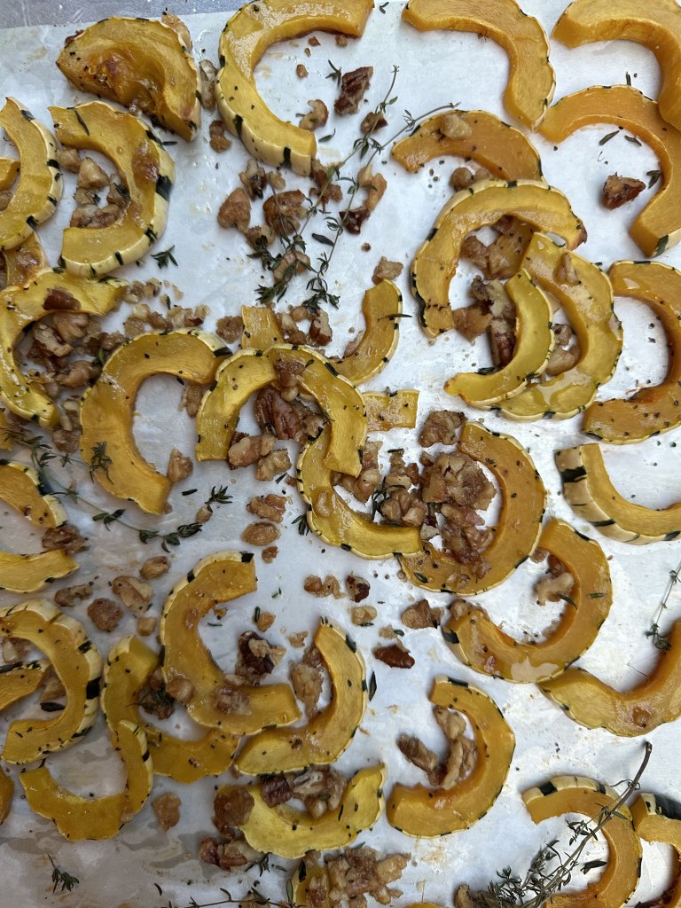 oasted Delicata Squash with Fresh Thyme & Candied Pecans – a fall favorite that’s both cozy and delicious! The caramelized sweetness of delicata squash, paired with earthy thyme and crunchy, candied pecans, makes for the perfect autumn side dish. Whether it’s a holiday table or a simple weeknight dinner, this dish brings warmth and seasonal flavors to every bite.