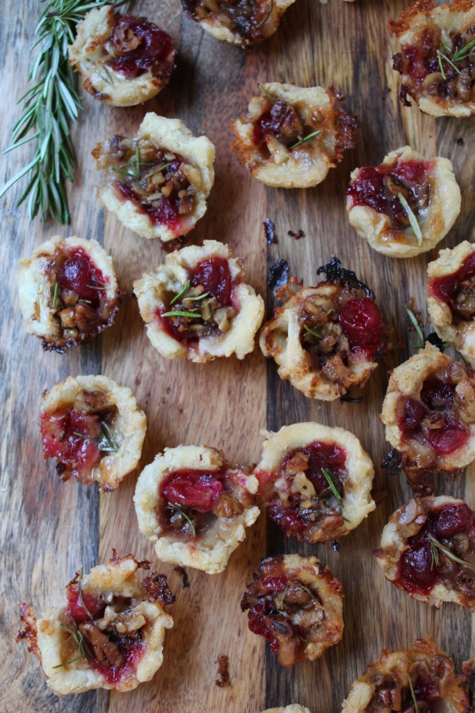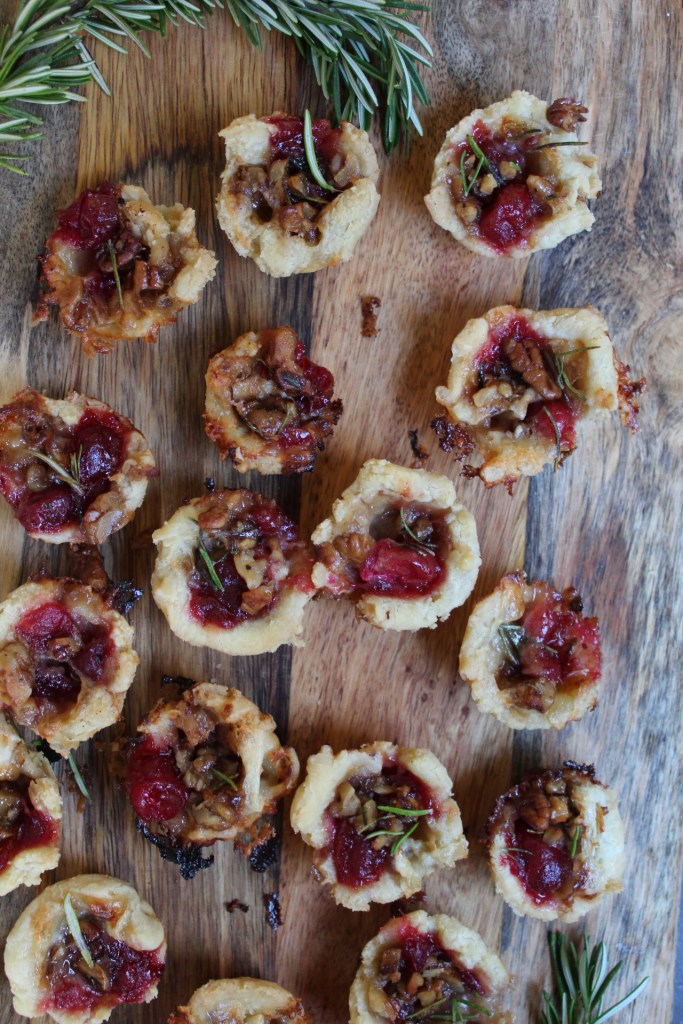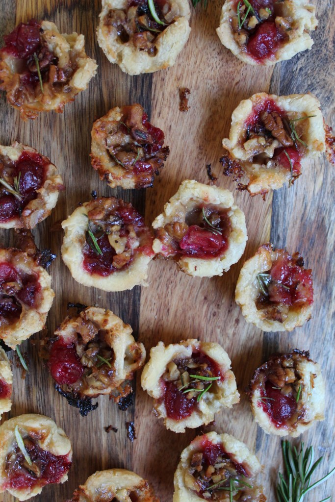 - Add a cube of Brie to each dough cup, then top with a spoonful of cranberry sauce. Sprinkle with chopped candied pecans.